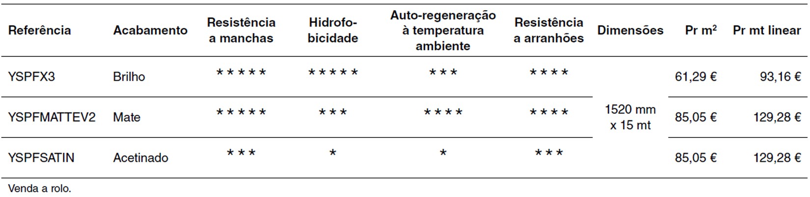 Disponível em brilho, mate e preto brilho (na tabela abaixo poderá identificar as caraterísticas dos materiais).