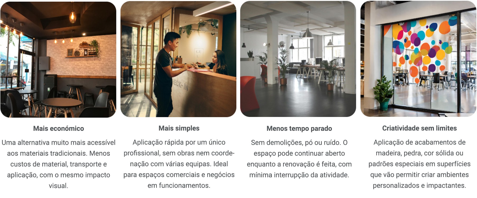 Se o seu cliente ainda tiver dúvidas, mostre-lhe casos de estudo reais. Exemplos de empresas que escolheram revestimentos decorativos em vez de uma renovação tradicional, conseguindo atualizar os seus espaços em muito menos tempo e com o mínimo impacto para clientes e colaboradores.